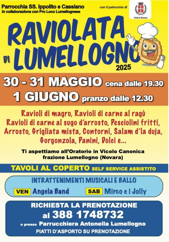 torna la rinomata manifestazione della Parrocchia di Lumellogno, patrocinata dal Comune di Novara. Vi aspettiamo per gustare i ravioli ai due sughi, pesciolini, arrosto, grigliate, gorgonzola e altre specialità del territorio. Venerdì e sabato intrattenimenti musicali.