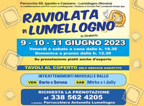 30, 31 maggio a cena dalle 19.30 e 1 giugno a pranzo dalle 12.30, nel cortile dell'oratorio con ingresso da Vicolo Canonica Lumellogno 1, si potranno gustare i rinomati ravioli ai tre sughi. Saranno proposti infatti i ravioli di magro al burro e salvia; i ravioli di carne al sugo di ragù o al sugo d'arrosto. Inoltre il menù è arricchito da grigliata di carne, pesciolini fritti, salame della duja e gorgonzola, patatine e dolci.