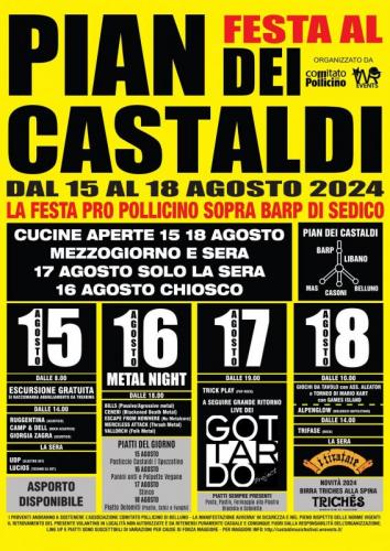CUCINE APERTE- giovedì 15 e domenica 18 agosto mezzogiorno e sera- sabato 17 agosto solo la sera- venerdì 16 agosto (metal night) solo chiosco serale con panini per tutti i gusti e polpette vegane