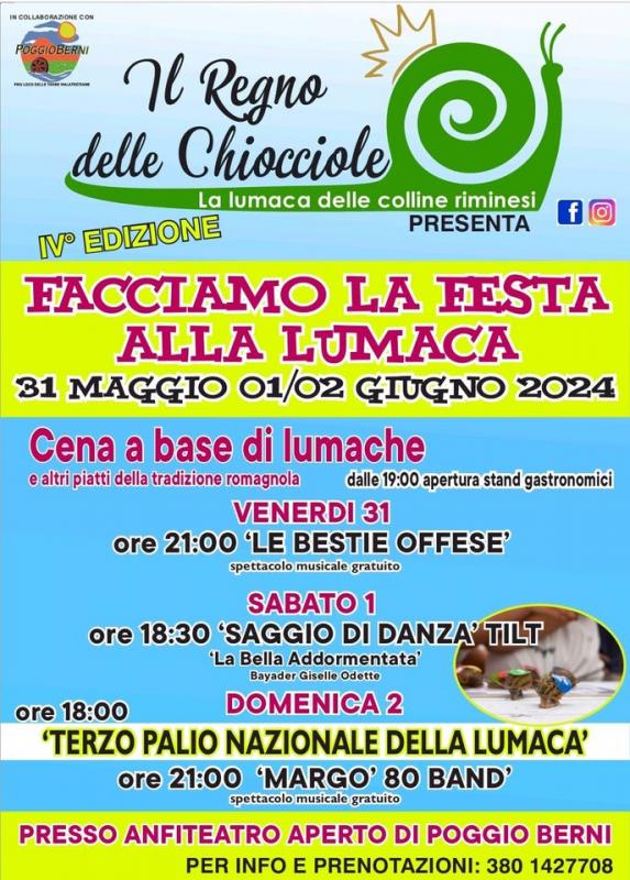 A Poggio Berni, frazione del Comune di Poggio Torriana in provincia di Rimini si svolge nei giorni dal 31 Maggio al 2 Giugno 2024 la 4a edizione di Facciamo la Festa alla Lumaca.