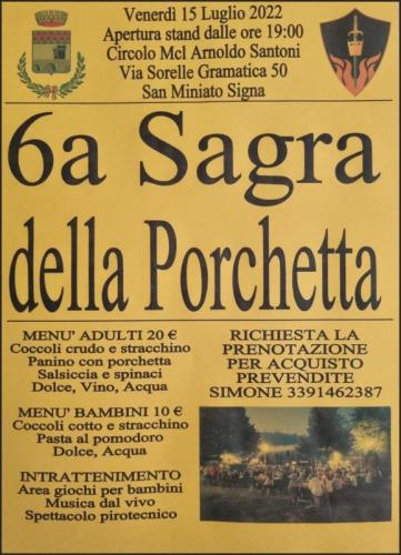 Presso il Circolo Mcl Arnoldo Santoni a San Miniato, frazione del Comune di Signa in provincia di Firenze si svolge nella giornata di Venerdì 15 Luglio 2022, dalle ore 19.00, la 6a edione della Sagra della Porchetta.