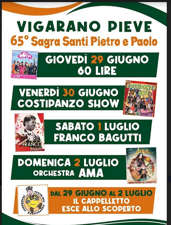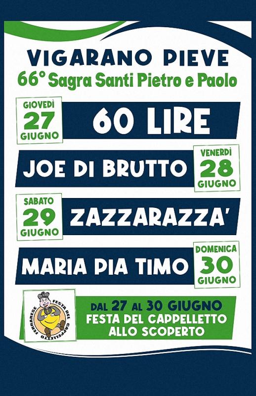 A Vigarano Pieve, frazione del Comune di Vigarano Mainarda in provincia di Ferrara si svolge nei giorni dal 26 al 29 Giugno 2025 la 67a edizione della Sagra dei SS. Pietro e Paolo.