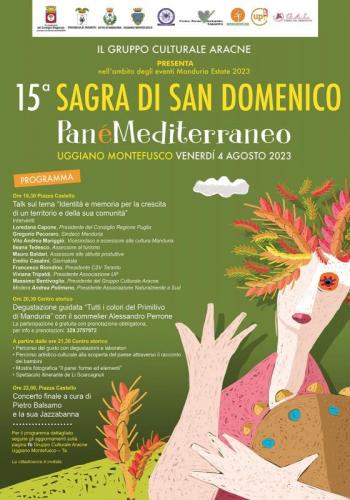 Il 4 agosto a partire dalle ore 20:00 torna a Uggiano Montefusco la Sagra di San Domenico -Panèmediterraneo. Giunta alla 15a edizione, la manifestazione è l’evento culturale di punta della comunità uggianese, in cui la frazione di Manduria viene raccontata in modo coinvolgente, grazie alla formula cultura-enogastronomia-musica.