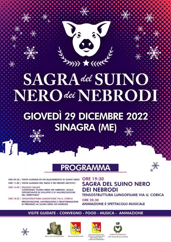 La Pro Loco di Sinagra in collaborazione con l’amministrazione comunale organizza la sagra del suino nero dei Nebrodi finanziata dall’assessorato regionale dell’agricoltura dello sviluppo rurale e della pesca mediterranea.