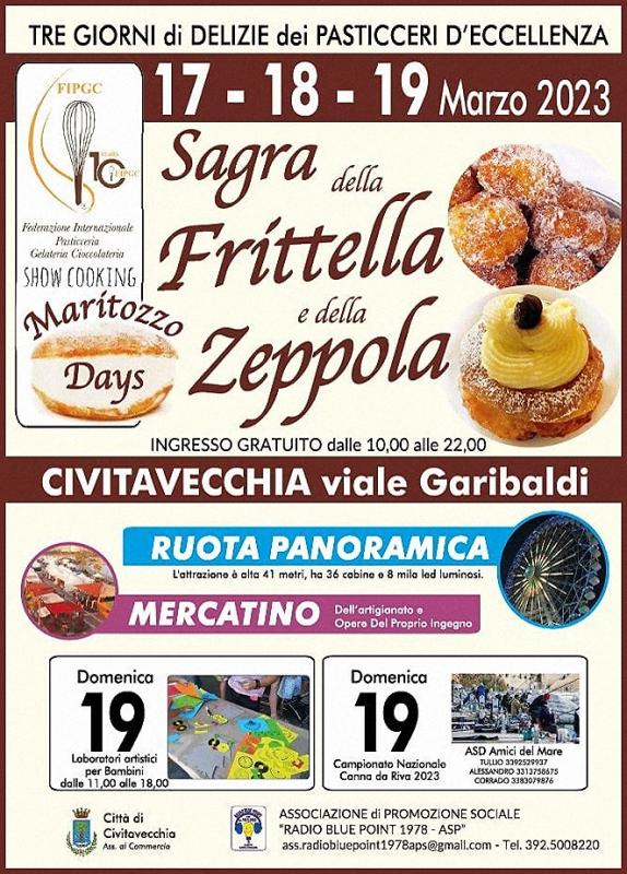 Presso Viale Garibaldi a Civitavecchia in provincia di Roma si svolge nei giorni 17, 18, 19 Marzo 2023 la Sagra della Frittella e della Zeppola con il Maritozzo Day.