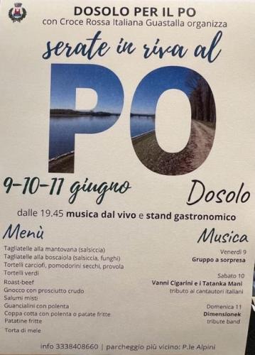 DOPO IL GRANDE SUCCESO DELLO SCORSO ANNO ,L 'ASSOCIAZIONE DOSOLO PER IL PO CON LA COLLABORAZIONE DELLA CROCE ROSSA DI GUASTALLA ORGANIZZA A DOSOLO 3 SERATE ALL INSEGNA DELLA MUSICA ,CON STAND GASTRONOMICO,DI PIATTI LOCALI