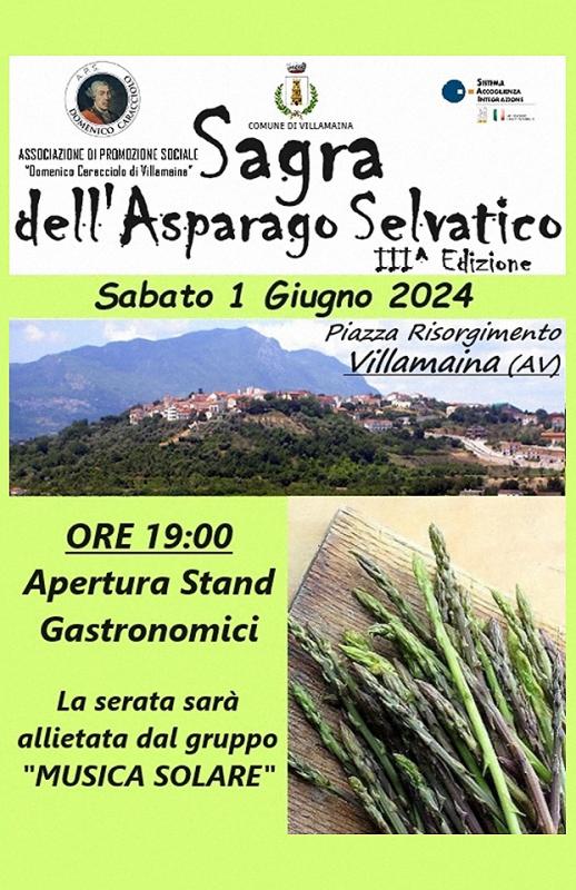 In Piazza Risorgimento a Villamaina in provincia di Avellino si svolge nella giornata di Sabato 01 Giugno 2024, dalle ore 19.00, la 3a Edizione della Sagra dell'Asparago Selvatico.