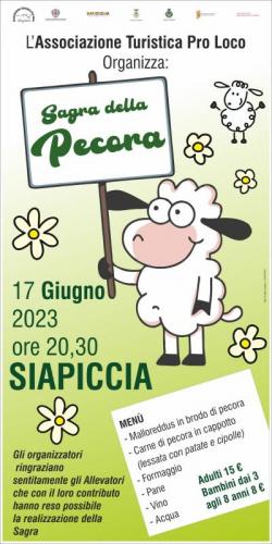 Nel piccolo comune di Siapiccia in provincia di Oristano, il 17 giugno alle ore 20,30 in piazza Giuseppe Garibaldi ,la proloco cittadina organizza la sagra della pecora, cena tipica sarda della nostra comunità. L'ospitalità e cortesia, oltre al buon cibo è garantita.