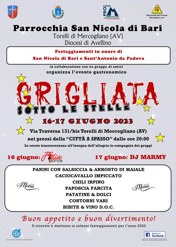 Siamo alle porte dell'estate e il comitato dei festeggiamenti della nostra parrocchia in collaborazione con un gruppo di amici organizza il 16 e 17 giugno la manifestazione gastronomica denominata “GRIGLIATA SOTTO LE STELLE” per dare il benvenuto all’estate.