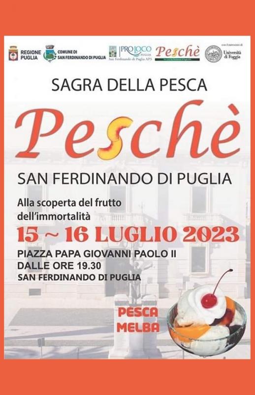 In Piazza Papa Giovanni Paolo II a San Ferdinando di Puglia in provincia di Barletta-Andria-Trani si svolge nei giorni 15 e 16 Luglio 2023, dalle ore 19.30, la Sagra della Pesca "Peschè".