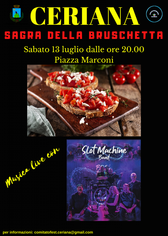 Sabato 13 luglio a partire dalle ore 19.30 in Piazza Guglielmo Marconi, il Comitato Festeggiamenti per Ceriana con il Comune di Ceriana propongono la quarta edizione della Sagra della Bruschetta il tutto accompagnato dalla musica live dei Slot Machine Band.