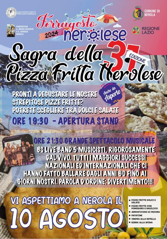 Storica sagra del borgo di Nerola, potrete gustare le ormai famose PIZZE FRITTE NEROLESI, impastate interamente a mano e fritte nell'olio exta vergine delle colline di Nerola, condite con sale, zucchero, pomodoro fresco o prosciutto.