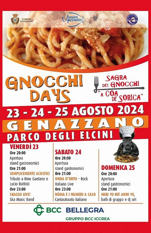 Vi aspettiamo a GENAZZANO (RM) il 23-24-25 AGOSTO 2024 nella suggestiva location del Parco Degli Elcini per la SAGRA DEI GNOCCHI "A COA DE SORICA", piatto tipico della cucina Genazzanese (formato di pasta fresca fatta con acqua e farina).