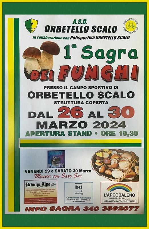 Presso il Campo Sportivo di Orbetello Scalo in provincia di Grosseto si svolge nei giorni dal 26 al 30 Marzo 2024 la Prima Edizione della Sagra dei Funghi.