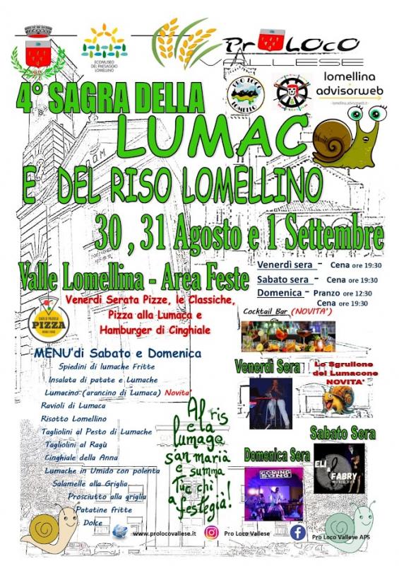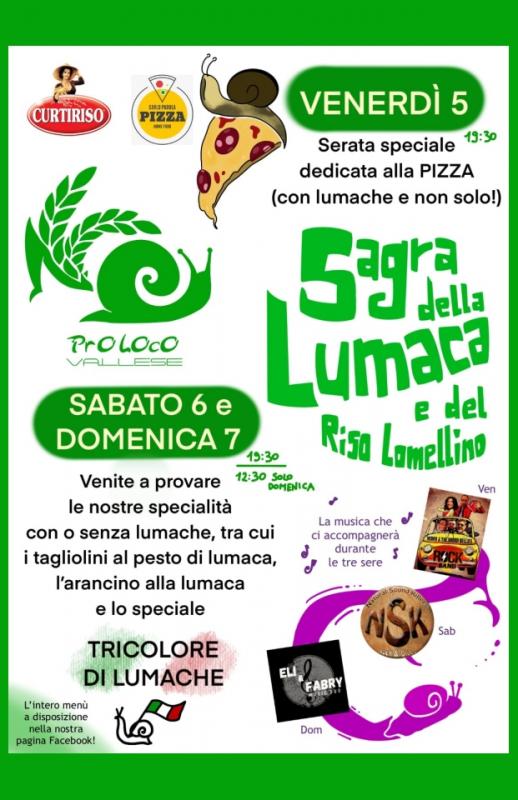 Torna a Valle Lomellina con la 5a edizione la Sagra della Lumaca e del Riso Lomellino, con piatti a base di lumache, riso e altro. 5-6-7 settembre 2025.