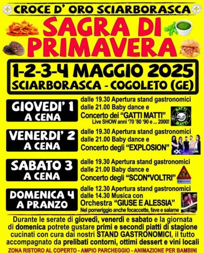 A Sciarborasca nel comune di Cogoleto (GE), torna la prima sagra dell'anno organizzata dalla Croce d’Oro di Sciarborasca e lo fa con una serata di divertimento in più, quella del primo maggio!