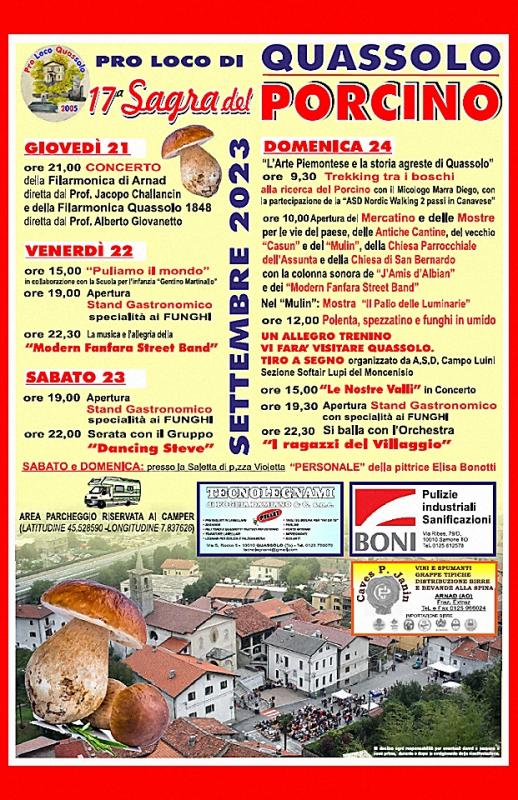 Arriva la 17a edizione della Sagra del Porcino di Quassolo, che questanno si svolge il 21, 22, 23, 24 Settembre 2023.