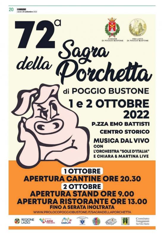 La 72a Edizione della Sagra della Porchetta a Poggio Bustone si svolge il 1 e 2 Ottobre 2022.