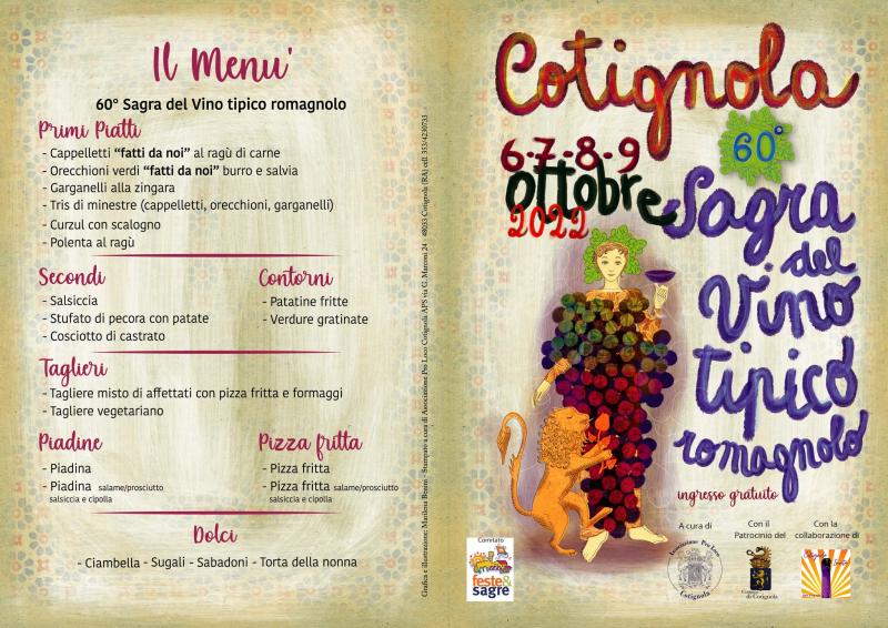 La Sagra del vino tipico romagnolo è organizzata dalla Pro loco di Cotignola, che quest’anno festeggia i sessant’anni di attività, in collaborazione con la rete di imprese Cotignola Invita e con il patrocinio dell’Amministrazione comunale.