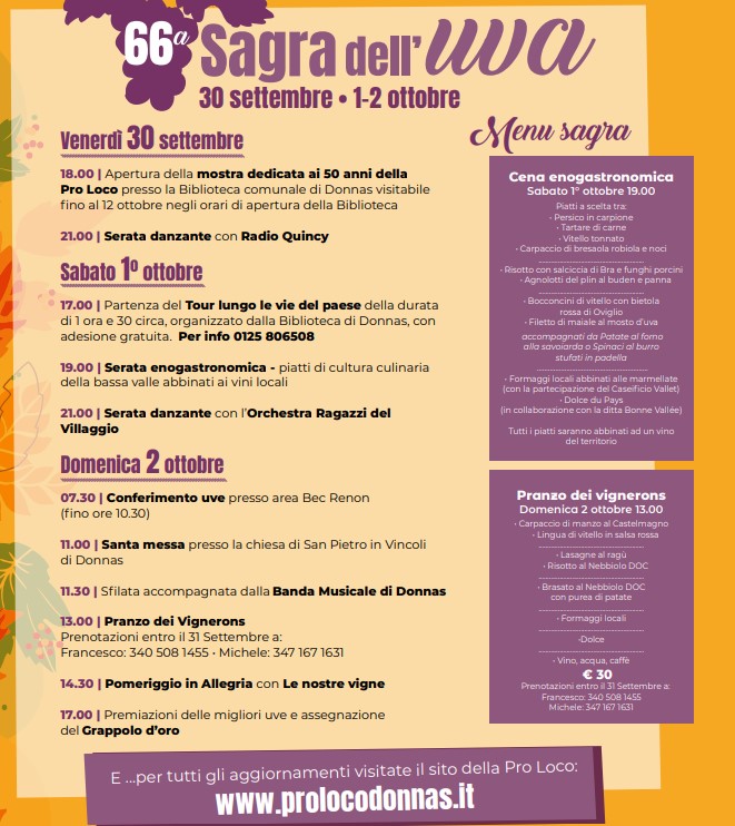 La 66a edizione della Sagra dell'Uva a Donnas (AO) si sterrà nei giorni 30 settembre e 1-2 Ottobre 2022.