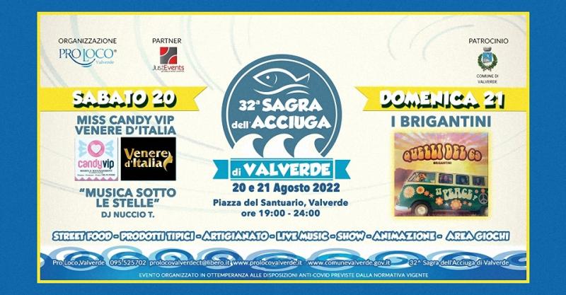 La 32ª “Sagra dell’Acciuga” di Valverde (Catania) è un evento fieristico e di intrattenimento dedicato al prodotto tipico simbolo del paese etneo, l’acciuga: saranno presenti stand con prodotti tipici della tradizione popolare siciliana e sarà possibile la degustazione di diversi piatti a base di acciuga.