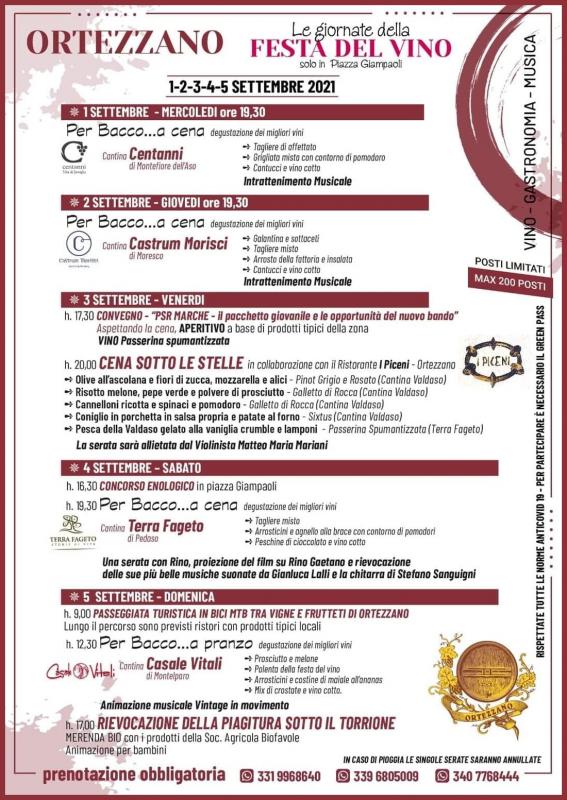 In Piazza Giampaoli a Ortezzano in provincia di Fermo si svolge nei giorni dal 01 al 05 Settembre 2021 la Festa del Vino.