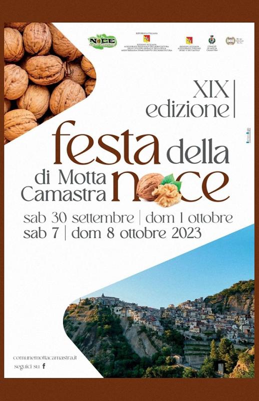 La 19a edizione della Festa della Noce a Motta Camastra (ME) si svolge il 30 Settembre, 01 Ottobre e 07, 08 Ottobre 2023.