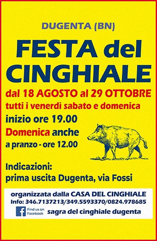 La Festa del cinghiale a Dugenta si svolge tutti i fine settimana dal 31 maggio al 14 Luglio e dal 23 Agosto al 27 Ottobre 2024.