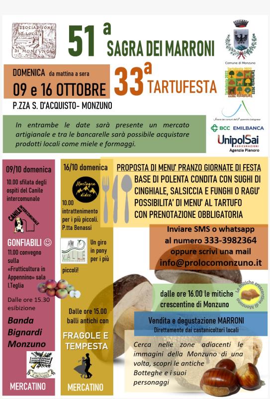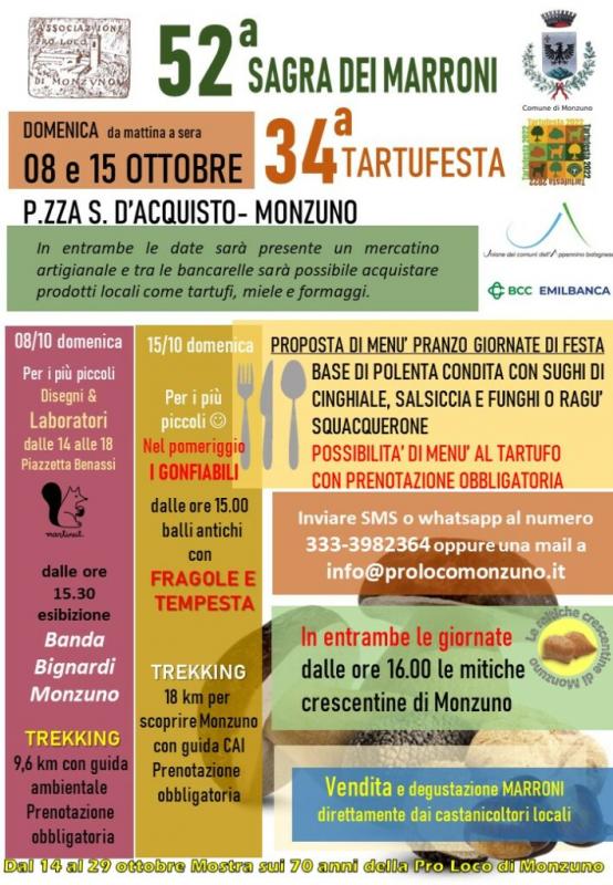 domenica 8 e 15 ottobre 2023 a Monzuno si svolgeranno la 34^ Tartufesta e la 52^ Sagra dei Marroni, in cui si troverà: gastronomia, mercato, prodotti tipici del bosco e sottobosco, mostre, intrattenimenti, musica, folclore e tanto altro.