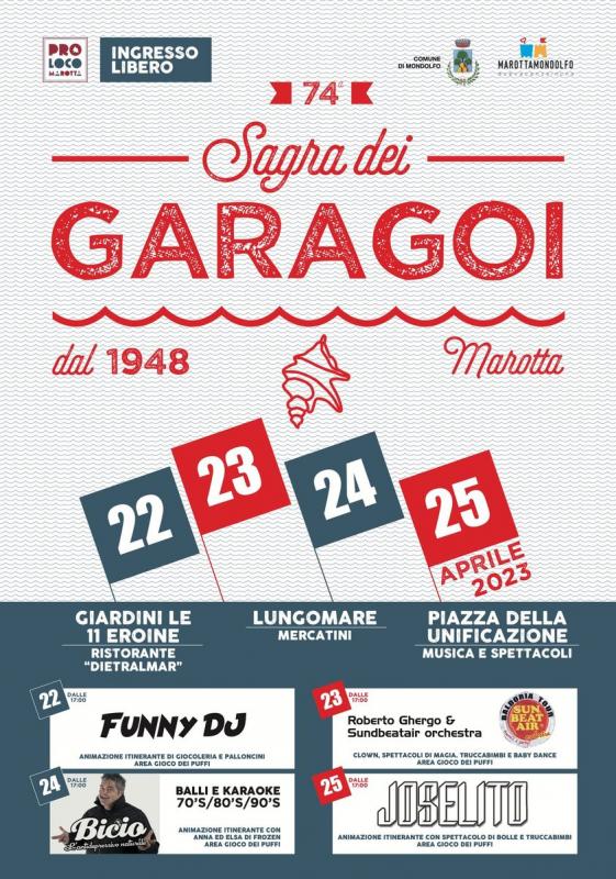 Dal 22-23-24-25 Aprile 2023, si svolge Sagra del Garagoi a Marotta di Mondolfo (PU), che quest'anno arriva alla sua 74^ edizione.