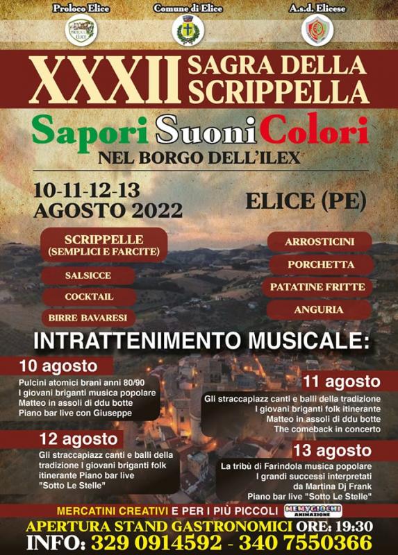 la Sagra della Scrippella a Elice dal 10 al 13 Agosto 2022, in collaborazione con la a.s.d. Elicese ,e del comune di Elice, abbiamo organizzato quattro serate d'agosto, con attività gastronomiche,compagnie teatrali tra le piazze.vivendo la magia del borgo dell' Ilex