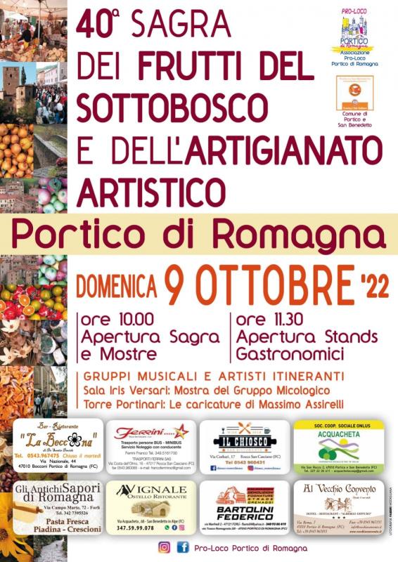 A cura della Pro Loco di Portico di Romagna la tradizionale Sagra dei frutti del sottobosco con mercato dei prodotti di stagione come funghi, tartufi, castgne e dei prodotti di artigianato locale. Inoltre nell'area dei giardini pubblici la Pro Loco allestirà il tradizionale stand gastronomico con menù a base di prodotti tipici del territorio, dolci fatti in casa e vini locali. All'nterno della manifestazione si svolgeranno spettacoli di artisti di strada itineranti.