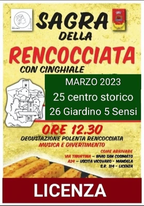 25 e 26 Marzo 2023 la Sagra della polenta rencocciata organizzata, come ogni anno, dalla Pro loco di Licenza, delizioso borgo sito a circa 50 km da Roma e immerso nel verde del Parco Regionale Naturale dei Monti Lucretili.