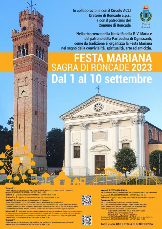 In collaborazione con il Circolo ACLI Oratorio di Roncade a.p.s. e con il patrocinio del Comune di Roncade, nella ricorrenza della Natività della B.V. Maria e del patrono della Parrocchia di Ognissanti, come da tradizione si organizza la Festa Mariana nel segno della convivialità, spiritualità, arte ed amicizia