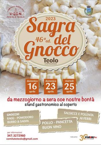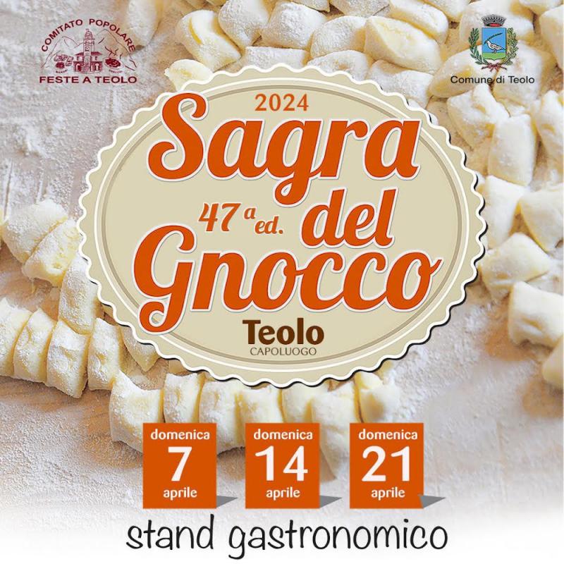 La 47^ edizione della tradizionale Sagra del Gnocco a Teolo in Piazza Perlasca che si svolgera il 7 - 14 - 21 Aprile 2024 il piatto principe sono gli gnocchi di patate fatti a mano al momento.