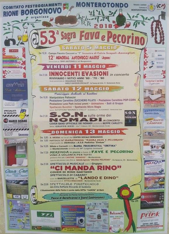 Nel fine settimana di venerdì 11, sabato 12 e domenica 13 maggio 2018 si svolge la 53^ edizione della Sagra delle Fave e Pecorino a Monterotondo, storico eventi curato dal Comitato Festeggiamenti Rione Borgonovo.