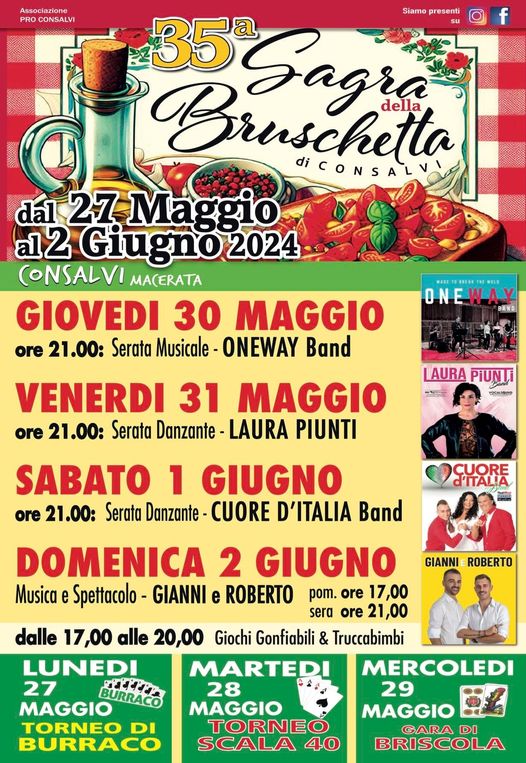 Dal 30, 31 Maggio al 2 Giugno 2024 si svolge la 35a edizione della Sagra della Bruschetta a Consalvi di Macerata (MC).