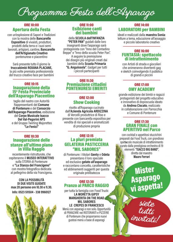 alla Festa Asparago Piacentino di Pontenure si troverà la mostra e vendita asparagi locali insieme al consueto mercatino domenicale del riuso e delle mille bontà; stand gastronomici dove poter gustare primi, secondi, torte salate e frittate presso il campo sportivo il venerdì e sabato sera, e la domenica da mezzogiorno in poi.