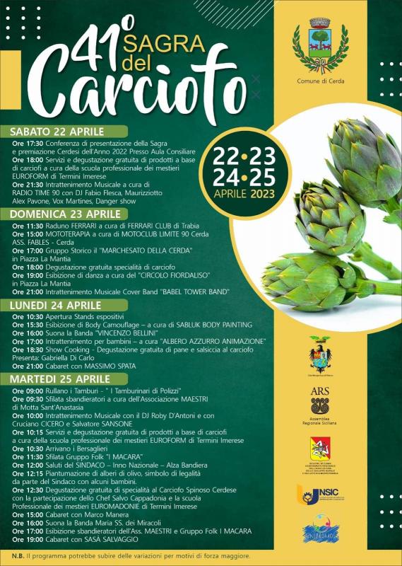 La 41a edizione della Sagra del Carciofo di Cerda si svolge dal 23 al 25 Aprile 2023 (Festa della Liberazione), con musica tradizionale, cibo genuino e mostre di prodotti artigianali.