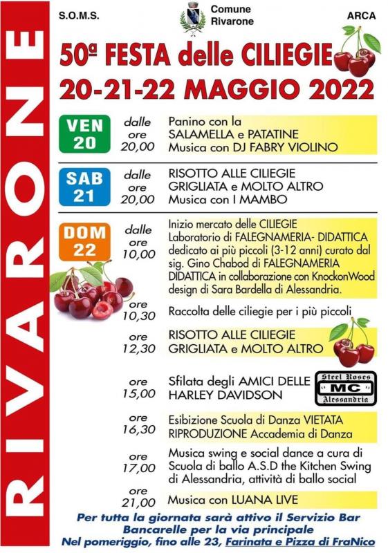 A Rivarone in provincia di Alessandria si svolge dal 22 al 22 Maggio 2022 la 50a edizione della Sagra delle Ciliegie.