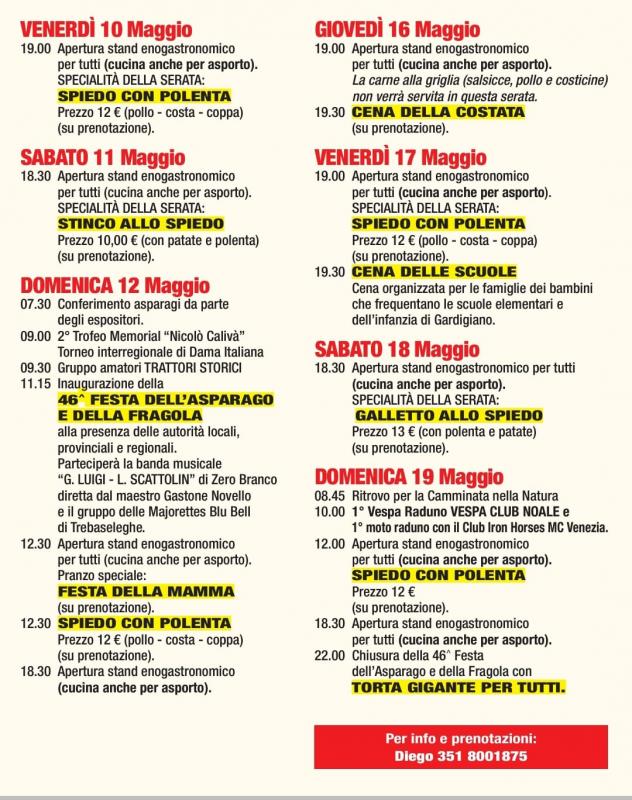 La 46a edizione della Sagra dell'Asparago di Badoere IGP e della Fragola a Gardigiano, frazione del comune di Scorzè, si svolge il 10, 11, 12, 16, 17, 18, 19, Maggio 2024.