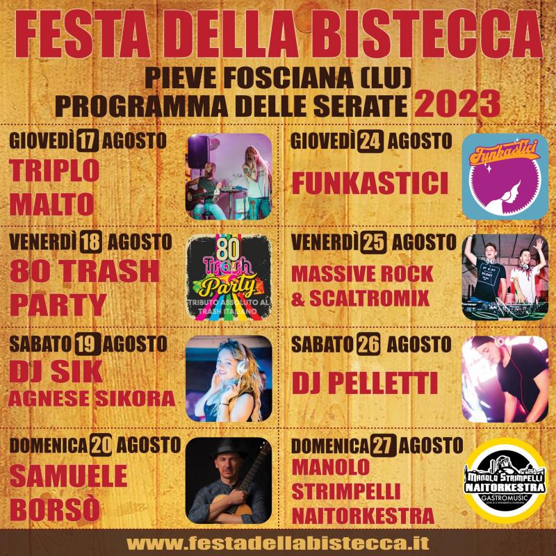 la Festa della Bistecca a Pieve Fosciana in Garfagnana (LU) , con la sfida della bistecca da 2 kg, che si svolge nei giorni 17-18-19-20/ 24-25-26-27 Agosto 2023, in Viale Europa Presso gli impianti Sportivi.
