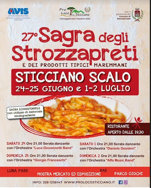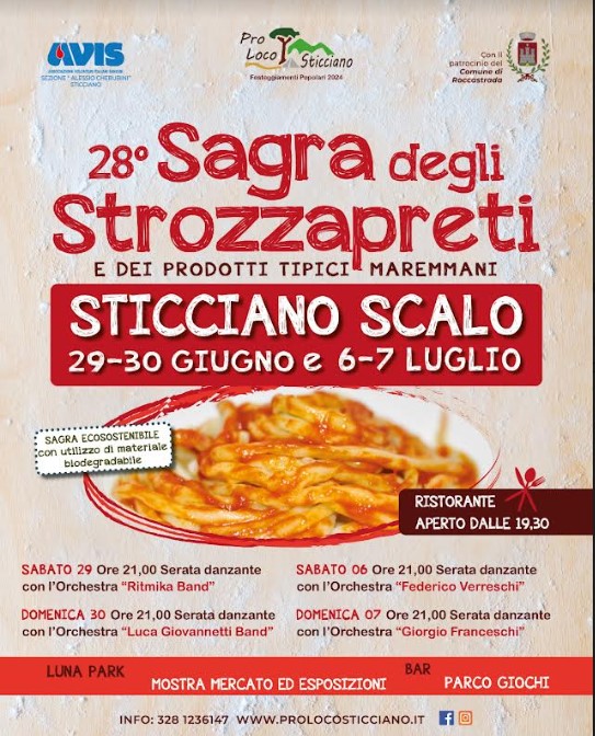 L’evento, giunto alla 28°edizione, è organizzato dalla Pro Loco di Sticciano e si terrà presso la struttura polivalente dove sarà possibile gustare prodotti tipicamente maremmani ed in particolare gli strozzapreti, a cui la sagra è dedicata. Si tratta di un tipo di pasta della tradizione della maremma grossetana, realizzata con ingredienti semplicissimi come acqua e farina e conditi con sughi realizzati dalle sapienti mani delle cuoche di Sticciano.