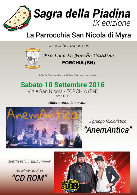 In occasione della nona sagra della piadina che si terrà a Forchia (BN) il 10 settembre 2016, gli AnemAntìca daranno vita ad un esilarante spettacolo di musica popolare. Un viaggio tra i ritmi del sud nella suggestiva cornice della città Beneventana.A seguire ci sarà lo spettacolo del duo comico "I CD ROM".Tante specialità e tanta buona musica con un programma ricco di sorprese.