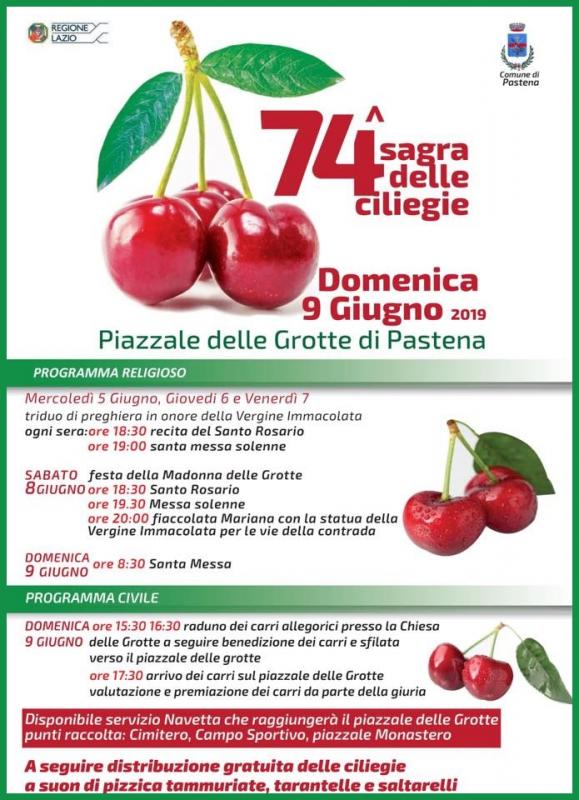 Domenica 09 Giugno 2019 si svolge la 74a edizione della Sagra delle Ciliegie, un evento apprezzato da molti che ogni anno si recano a Pastena per vedere i carri allegorici e gustare le ciliegie.