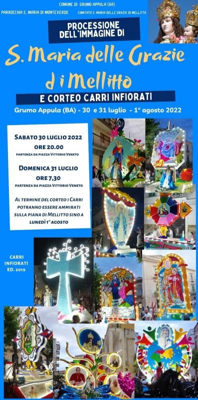 Domenica 31 luglio 2022 ore 7,30: Processione della Statua della Madonna e corteo Carri infiorati da Grumo a Mellitto