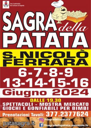 Patasagra, La Sagra della Patata torna a San Nicolò di Argenta (FE) nelle sere: 6, 7, 8 9 e 13, 14, 15-16 giugno 2024.
