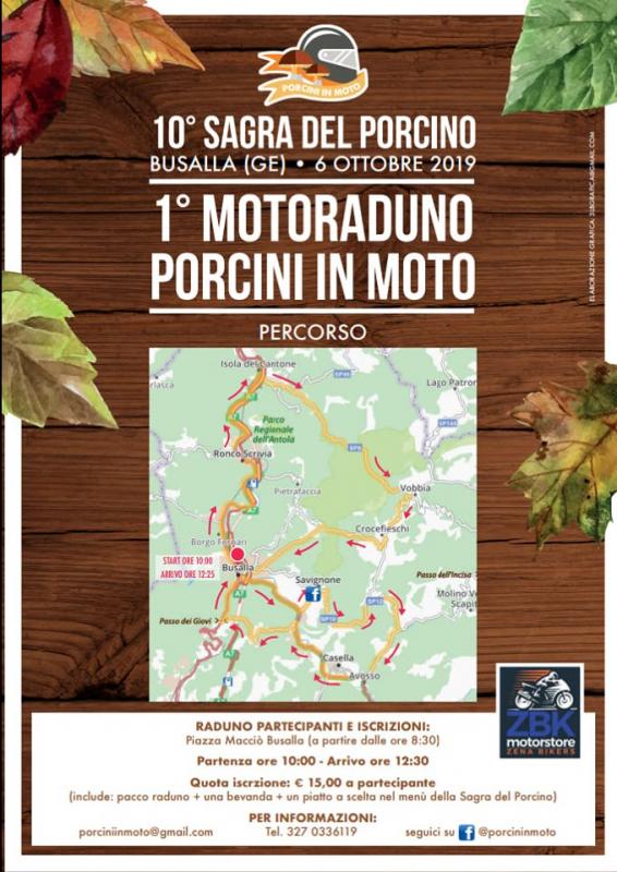 Una delle novità della X Sagra del Porcino 2019 é la prima edizione del motoraduno "Porcini in Moto". Domenica 6 Ottobre 2019 in piazza Macciò a Busalla (la piazza del Comune), a partire dalle 8.30, appuntamento per tutti i bikers interessati.