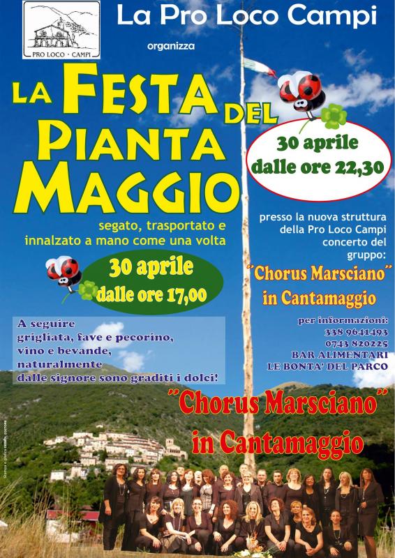Festa del PiantaMaggio 2016 a Campi di Norcia: il 30 aprile con il taglio del "Maggio", un pioppo scelto fra tanti per la sua imponenza e lunghezza; una volta spogliato della corteccia simbolo di purezza e fertilità, viene poi aggiunto un ramo rigoglioso simbolo dello sbocciare dell'amore, infine sulla sommità del "maggio" viene innalzata la bandiera italiana simbolo patriottico. La festa risale a tempi remotissimi, la festa fu sicuramente pagana, per celebrare i riti di maggio, della fertilità e della rinascita della terra. A seguire grigliata, fave e pecorino, dolci e bevande.