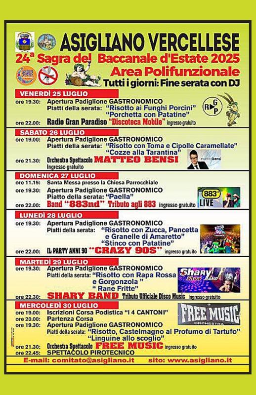 Ritorna ad Asigliano Vercellese (Vercelli) dal 25 al 30 Luglio per il ventiquattresimo anno consecutivo il "BACCANALE", appuntamento estivo imperdibile con la buona musica e la grande cucina piemontese.